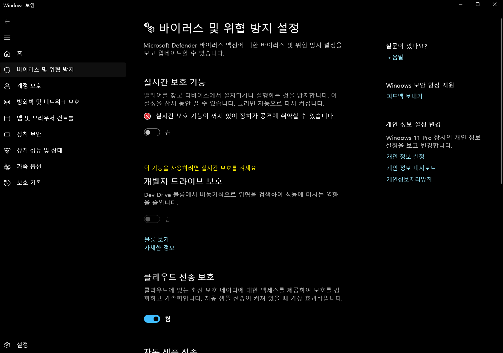 설정 - Windows 보안 - 바이러스 및 위협 방지 설정 - 실시간 보호 기능 : 끔